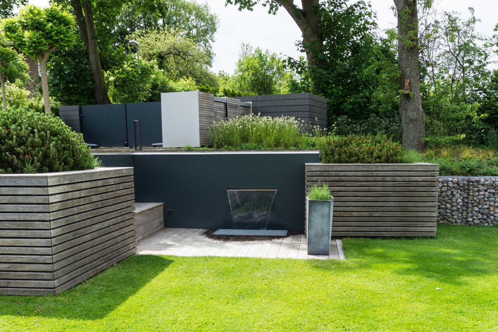 Das obere Element wird eine Sitzbank mit Terassendielen, zu der man von der Auffahrt aus gelangt. Unten entsteht eine Terasse mit einer weiteren Sitzbank und wir bauen einen Wandauslass für den Wasserfall bzw. Pool-Fontäne, deren Wasser in ein kleines Becken fließt. Im Nachhinein finde ich dieses Lösung viel besser und deutlich pflegeleichter. Wir sitzen regelmäßig oben auf der Sitzbankfläche und der untere Bereich mit der Terasse und dem Wasserauslass ist toll geworden.