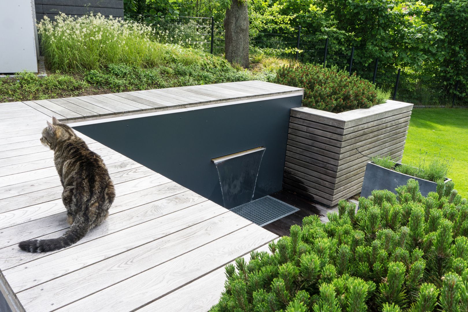 Wir hatten zuvor schon eine Holzauflage für das Becken gebaut, die es auch vor Blättern und Schmutz schützen sollte. Aber auch mit kleinen Kindern im Garten möchte man den Wasserfall nutzen können. Die Lösung dafür war ein Metallgitter, dass passgenau für den Beckauslass angefertigt wurd und das auf der Holzterasse aufliegt. Super ist auch, dass die Kinder jetzt ganz an den Wasserfall herangehen und mit dem Wasser spielen können – das ist für jedes Kind ein Anziehungspunkt.